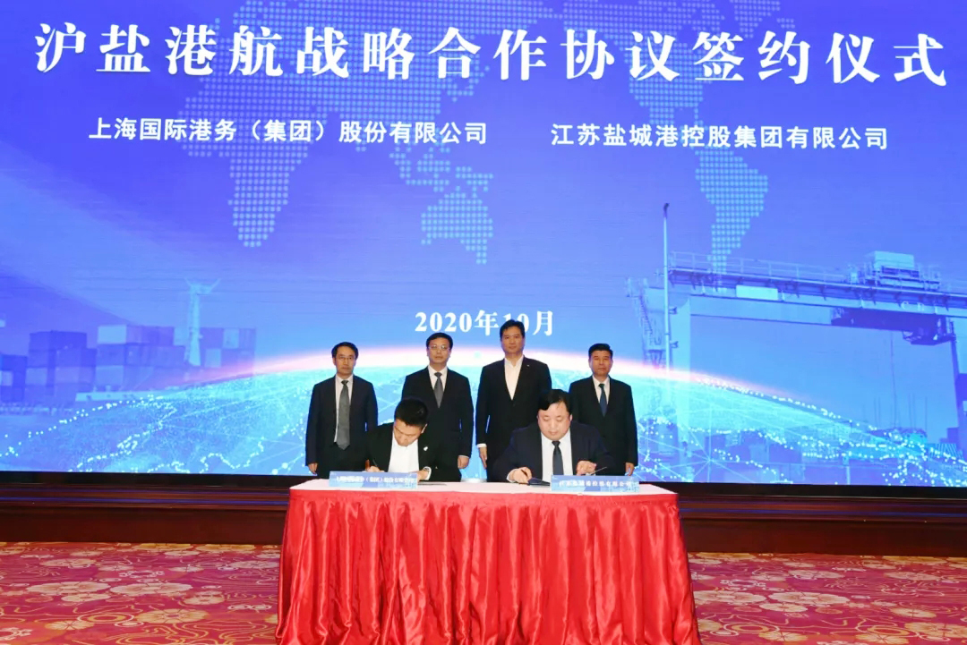 10月30日下午,沪盐港航合作活动暨盐城港集装箱海河联运航线推介会在盐城举行,江苏盐城港控股集团和上海国际港务集团签订战略合作协议。盐城市市长曹路宝、上海国际港务集团总裁严俊出席,共同为合资成立的江苏盐城港上港国际港务有限公司揭牌。