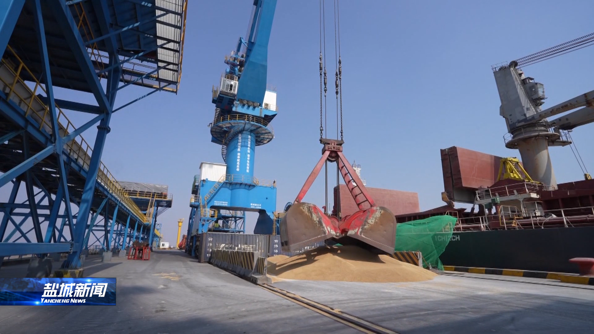 来到盐城港大丰港区粮食码头,一艘装载着澳大利亚大麦的货船正在卸货。接下来,还将有来自巴西装载着6万吨大豆的货船排队进港。