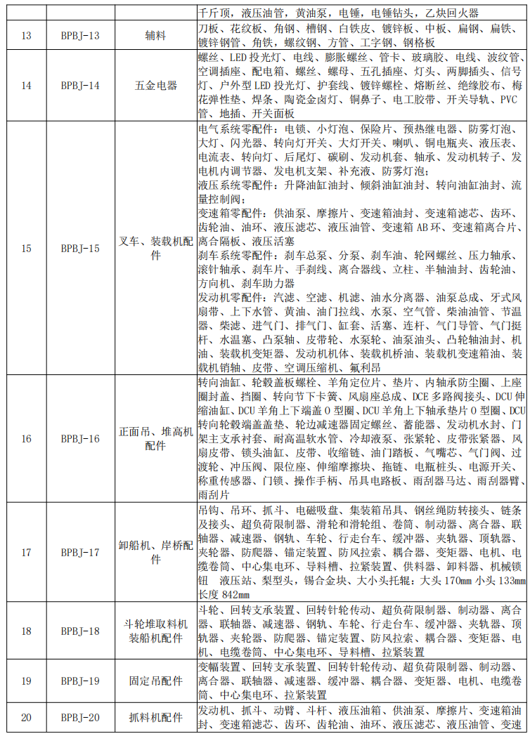 A部分:维修材料备品备件。招标范围:为德信体育(中国)官方网站 2023年港口设备维修材料备品备件提供采购、运输、验收、售后服务等服务工作,共分为 20 个标段,具体情况如下: