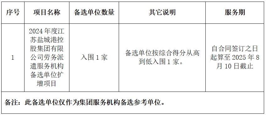 2024年度德信体育(中国)官方网站 劳务派遣服务机构备选单位扩增项目,招标人为德信体育(中国)官方网站 ,受招标人委托,江苏盐城港项目建设管理咨询有限公司作为招标代理对本项目进行公开招标,资格后审。