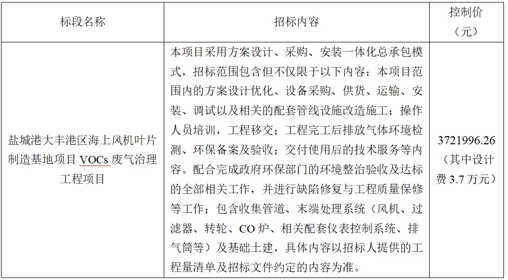 (1)项目名称:盐城港大丰港区海上风机叶片制造基地项目VOCs废气治理工程项目。