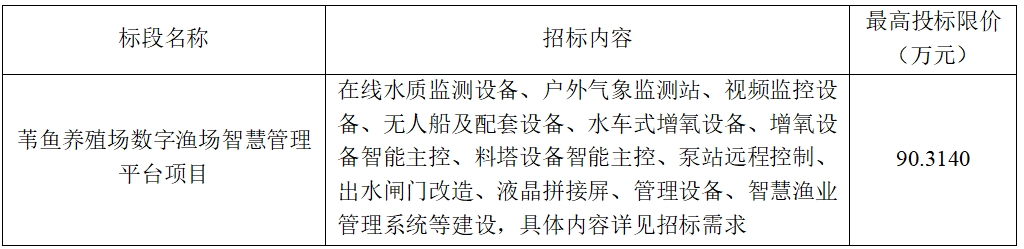 (6)项目标段划分:苇鱼养殖场数字渔场智慧管理平台项目共划分1个标段,标段信息如下: