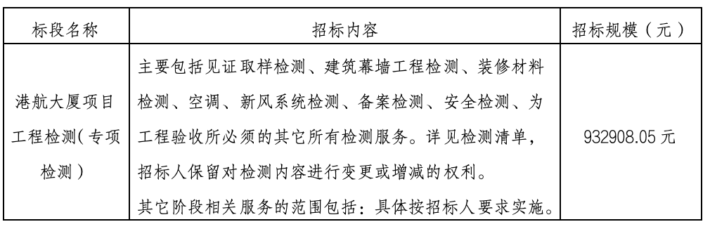 一、德信体育(中国)官方网站 负责实施的港航大厦项目工程检测(专项检测)已具备招标条件,项目所需资金已落实,现通过公开招标方式邀请潜在投标人参加本项目的投标。