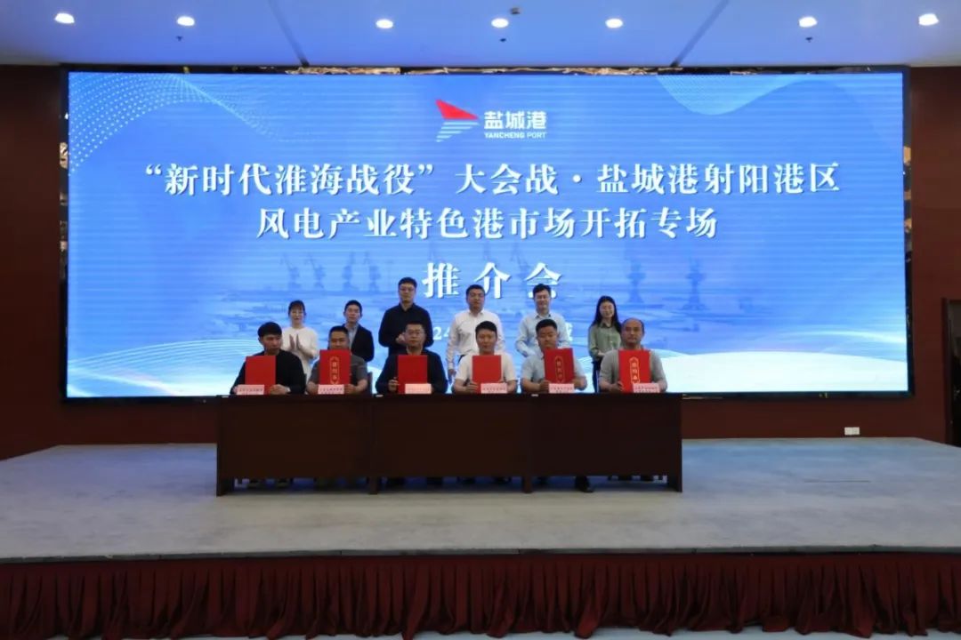 现场气氛热烈高涨。射阳港区与数十家客户代表签订协议,协议年中转风电叶片100套,预计实现营收超700万元。