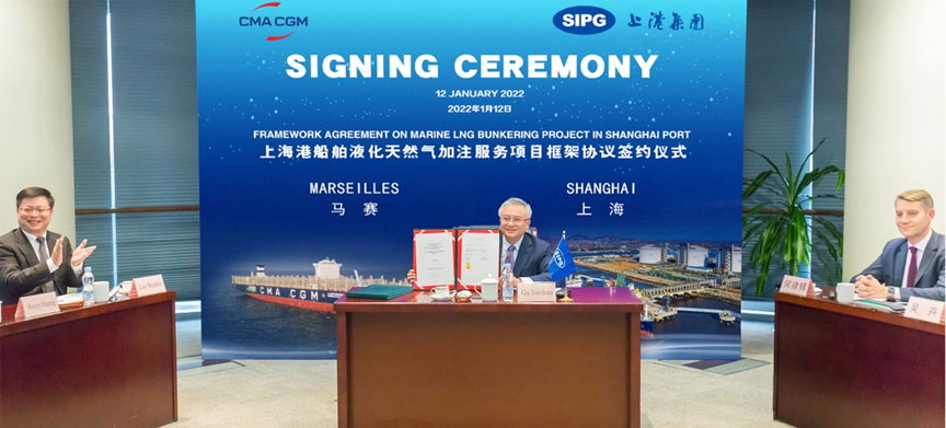上海国际港务(集团)股份有限公司(“上港集团”)与法国达飞海运集团(“达飞集团”)于2022年1月12日举行了上海港船舶液化天然气(LNG)加注服务项目框架协议签约仪式,上港集团董事长顾金山与达飞集团董事长、首席执行官鲁道夫·萨德出席。