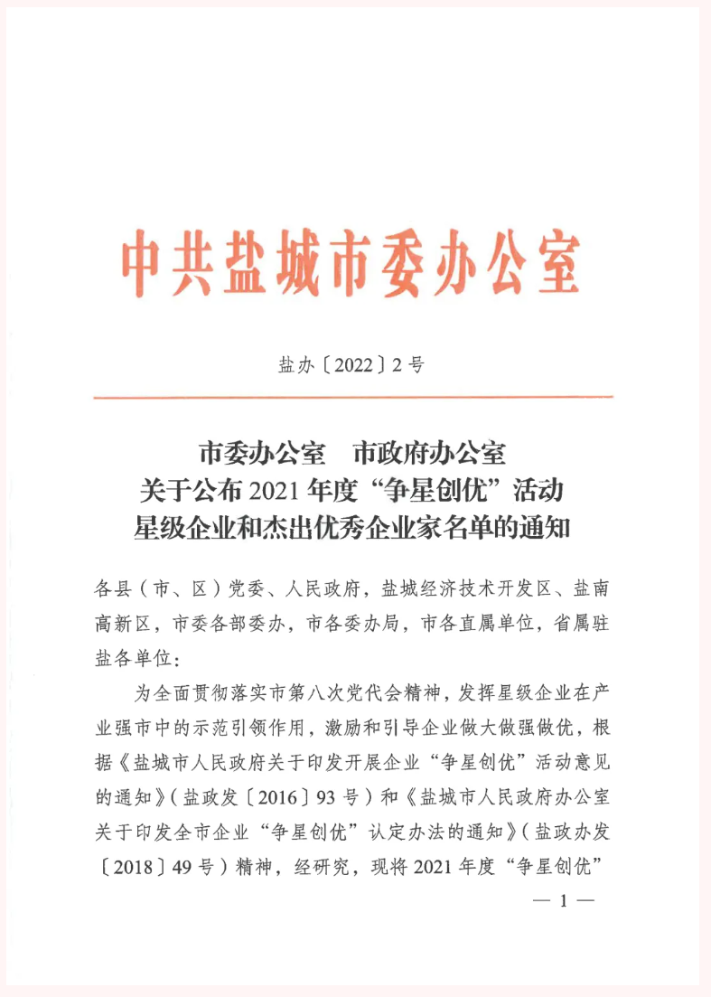 2月7日,春节后上班第一天,从全市勇当沿海地区高质量发展排头兵推进会暨2021年度综合考核表彰大会上传来好消息,集团荣获2021年度“争星创优”活动“服务业五星企业”荣誉称号,集团党委书记、董事长、总经理周正雄荣获“盐城市杰出企业家”荣誉称号。