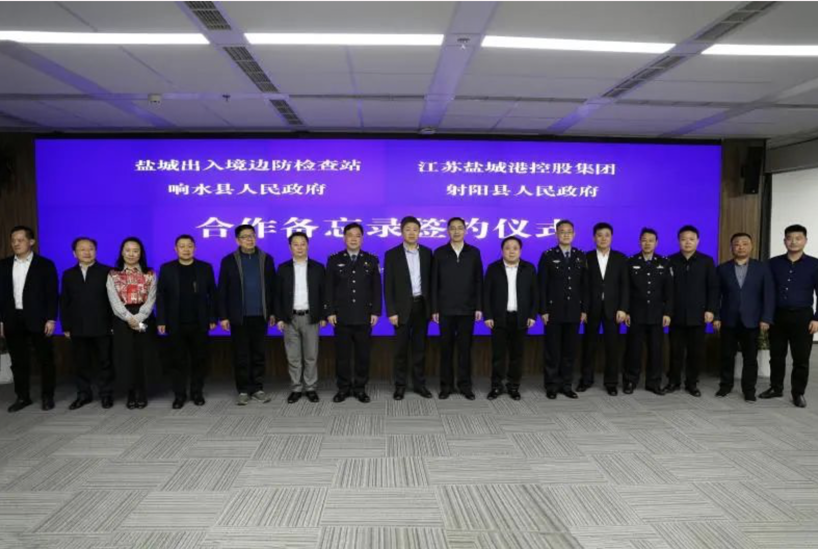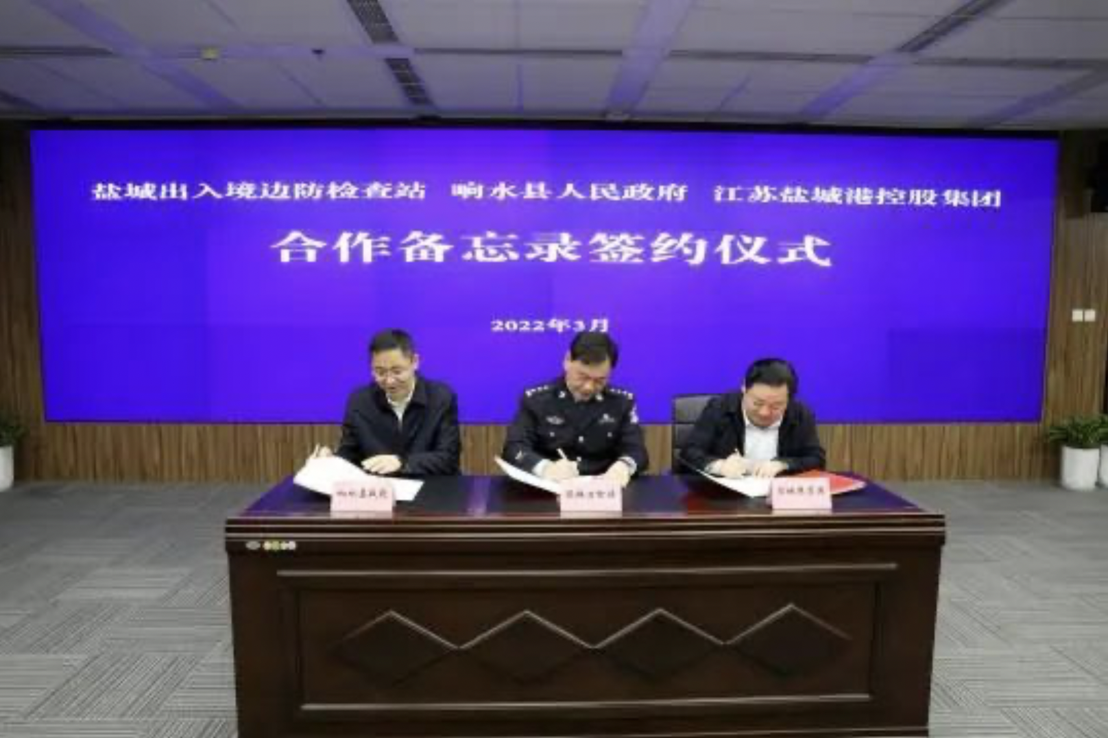 3月4日,盐城出入境边防检查站、响水县人民政府、射阳县人民政府、盐城港控股集团合作备忘录签约仪式在我集团举行。市商务局局长、党委书记、市口岸办主任郭庆生,盐城出入境边防检查站站长李兴华,集团党委书记、董事长、总经理周正雄,响水县委副书记、县长陆文忠,射阳县委常委、常务副县长凌晓东,响水县副县长田大波,射阳县副县长陈剑峰,盐城出入境边防检查站政治委员王海燕,市口岸办副主任、市商务局党委委员陈国亮,市口岸办副主任、市商务局党委委员、二级调研员韩玉军,集团党委委员、纪委书记周旭东,总经理助理孙永峰等参加。