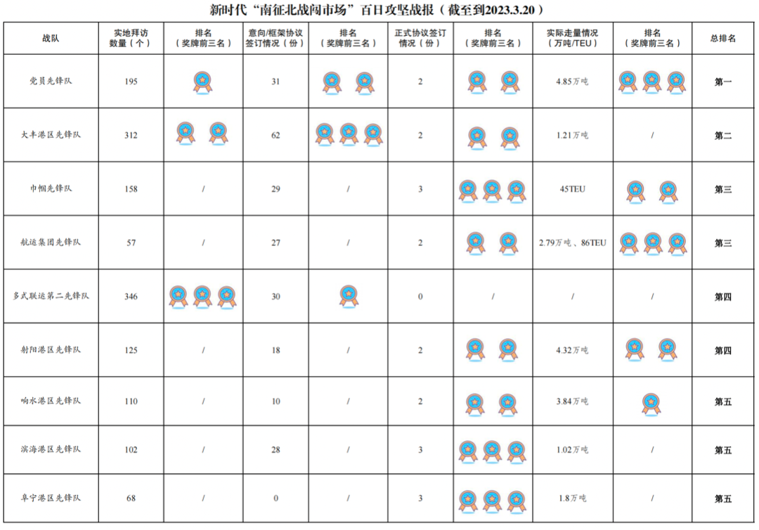 4.实际走量131TEU、23.56万吨:其中党员先锋队4.85万吨,射阳港区先锋队4.32万吨,响水港区先锋队3.84万吨,航运集团先锋队2.79万吨、86TEU,建湖港区先锋队2.53万吨,阜宁港区先锋队1.8万吨,大丰港区先锋队1.21万吨,亭湖港区先锋队1.2万吨,滨海港区先锋队1.02万吨,巾帼先锋队45TEU。