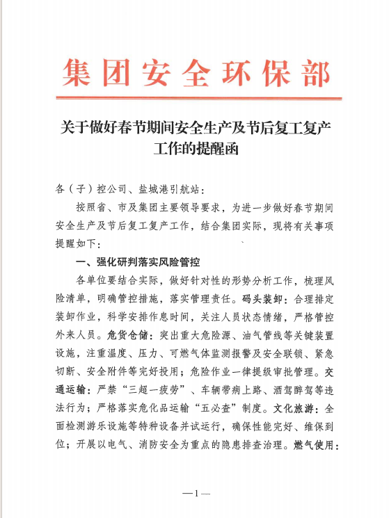 2024年是全面完成“十四五”规划目标任务的关键之年,是集团打造“五新示范港”的突破之年,也是安全生产治本攻坚三年行动的开局之年。集团党委高度重视安全生产、环境保护、平安建设工作,从行动上落实省、市决策部署,从源头上消除事故隐患,全力以赴落实落细安全生产、环境保护、平安建设各项工作,持续夯实高质量发展根基。