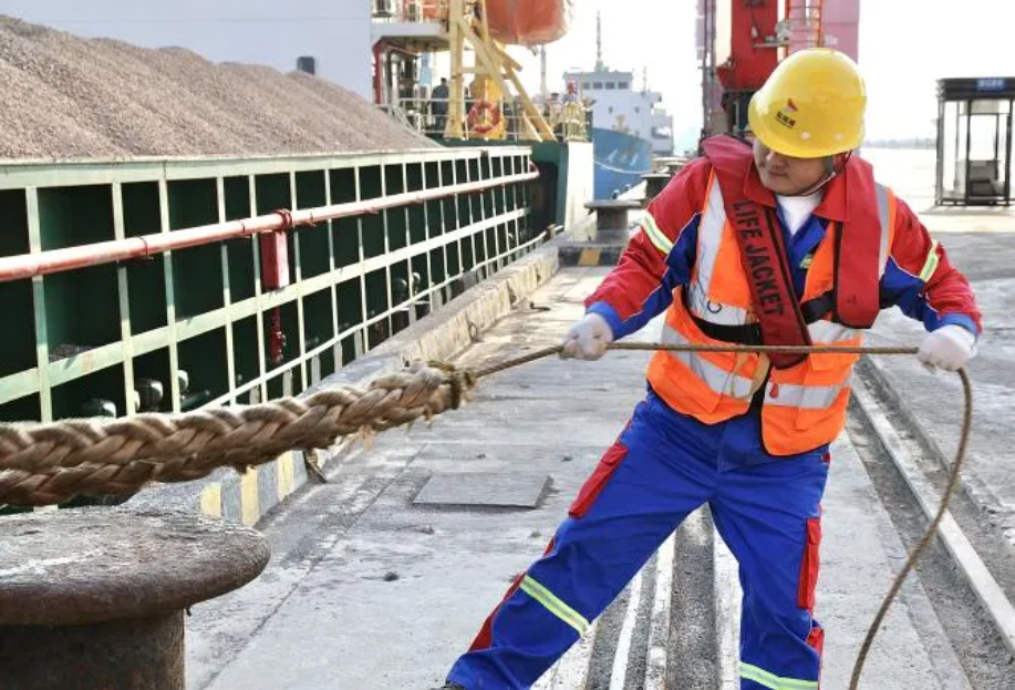 带缆工人在码头前沿紧握缆绳