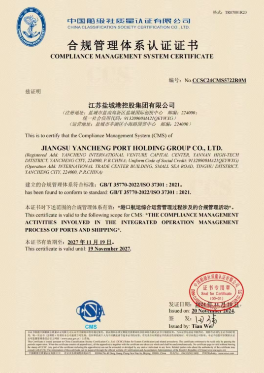 11月22日,德信体育 顺利通过中国船级社质量认证有限公司(CCSC)的合规管理体系审核认证,获得合规管理体系认证证书,成为江苏省首家获得合规管理体系证书的港航企业。