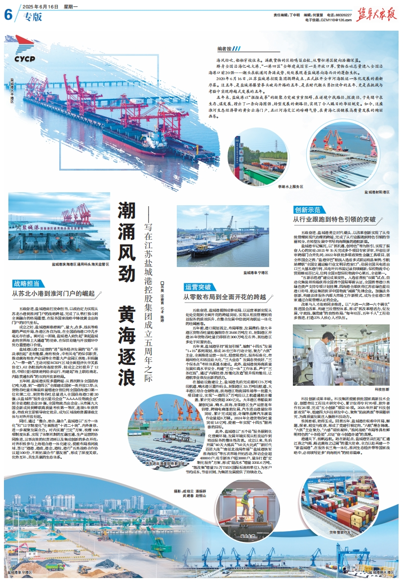五年来,盐城港坚持“规划引领”,编制“十四五”发展“1+15”系列规划,形成26份三年行动计划,聚力“六抓”主业,全面推进运营一体化、经营规范化、服务标准化、市场网格化和效益最大化,“三大业态” 发展态势良好,“三个保本点”考核体系基本建成。此外,盐城港统筹高质量发展和高水平安全,构建“三位一体”工作体系,严守“三条红线”,通过“内部挖潜、智能化改造”提升现有能级,让港航事业焕发出新的活力。
