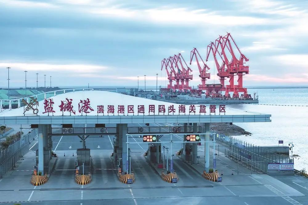 在基础设施建设上,盐城港先后完成灌河口5万吨级航道、响水港区重件码头、射阳港区3.5万吨级航道、大丰港区综合仓储物流、滨海港区物流园堆场等一批重大项目建设,实现“一港四区”万吨级以上航道通航全覆盖,累计完成投资超200亿元。大丰港区单船装卸屡创纪录,响水、滨海、射阳港区生产运营连年倍增,跨境电商蓬勃发展,汽车进出港量取得突破,累计完成起亚、奇瑞等品牌汽车滚装作业量超6万辆。2024年全港货物吞吐量突破1.6亿吨,提前一年实现“十四五”翻两番的目标。