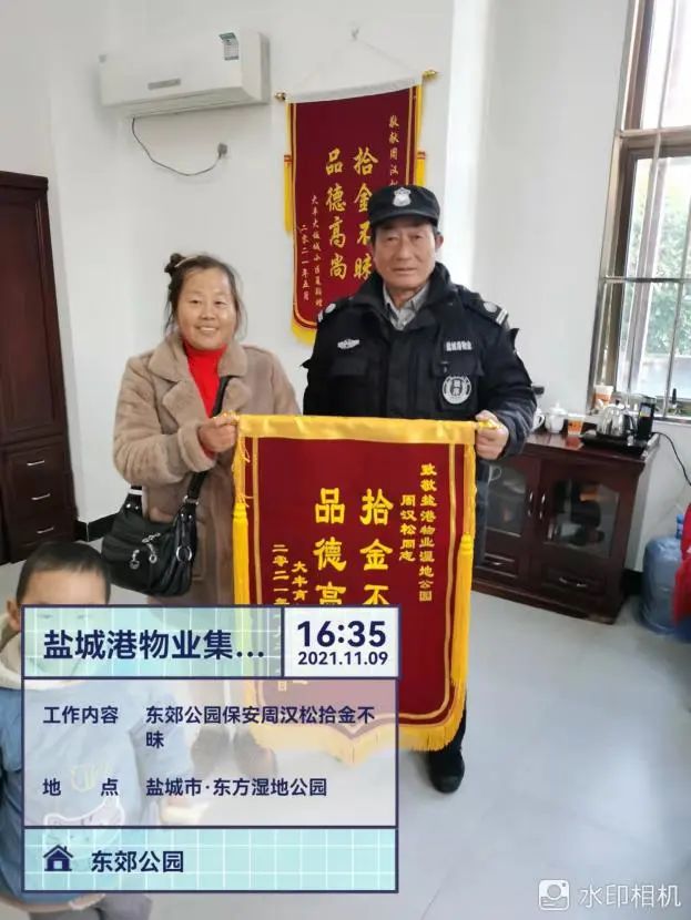 当天,失主沈女士特地将一面写有“品德高尚、拾金不昧”的锦旗送到东郊公园,对周汉松拾金不昧的高尚品德再一次表示感谢。