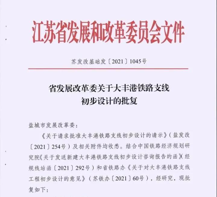 大丰港铁路支线是国家发展改革委等五部门联合印发的《关于加快推进铁路专用线建设的指导意见》(发改基础〔2019〕1445 号)文中明确的重点铁路支线项目,盐城市委市政府和省交通运输厅、省铁路集团计划今年全线开工建设。