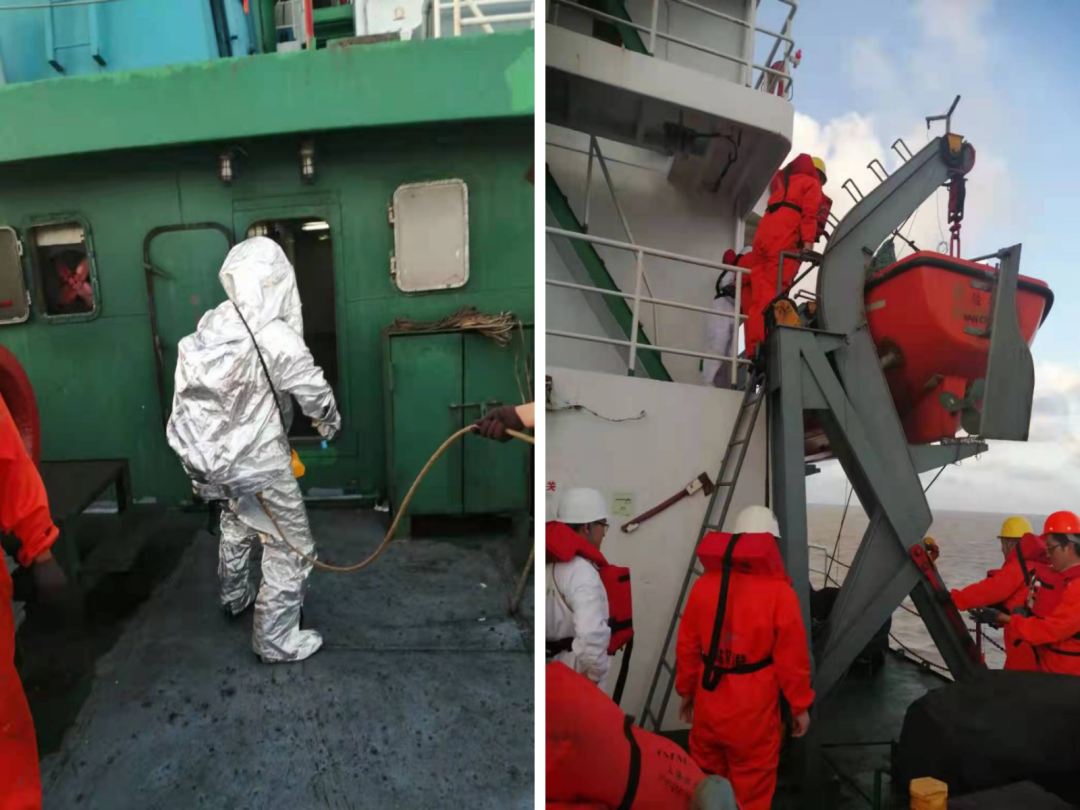 演习中,“申丰之花”轮按照既定演习方案,模拟船舶上层建筑起火,经过探火组探火、消防组降温灭火、医护组救助等一系列紧急有序的行动,实操演练了在船舶发生火情后的应急操作。在演练大火弃船过程中,全体船员穿着救生衣,携带防护服迅速前往集合点,在紧急情况下完成救生艇脱绑、人员登艇、遥控救生艇下降及救生艇回收等操作,顺利完成弃船全过程演练。整个演练环节流畅,人员操作熟练,取得了较好效果,为冬季船员人身安全和船舶航行操作安全打下坚实基础。