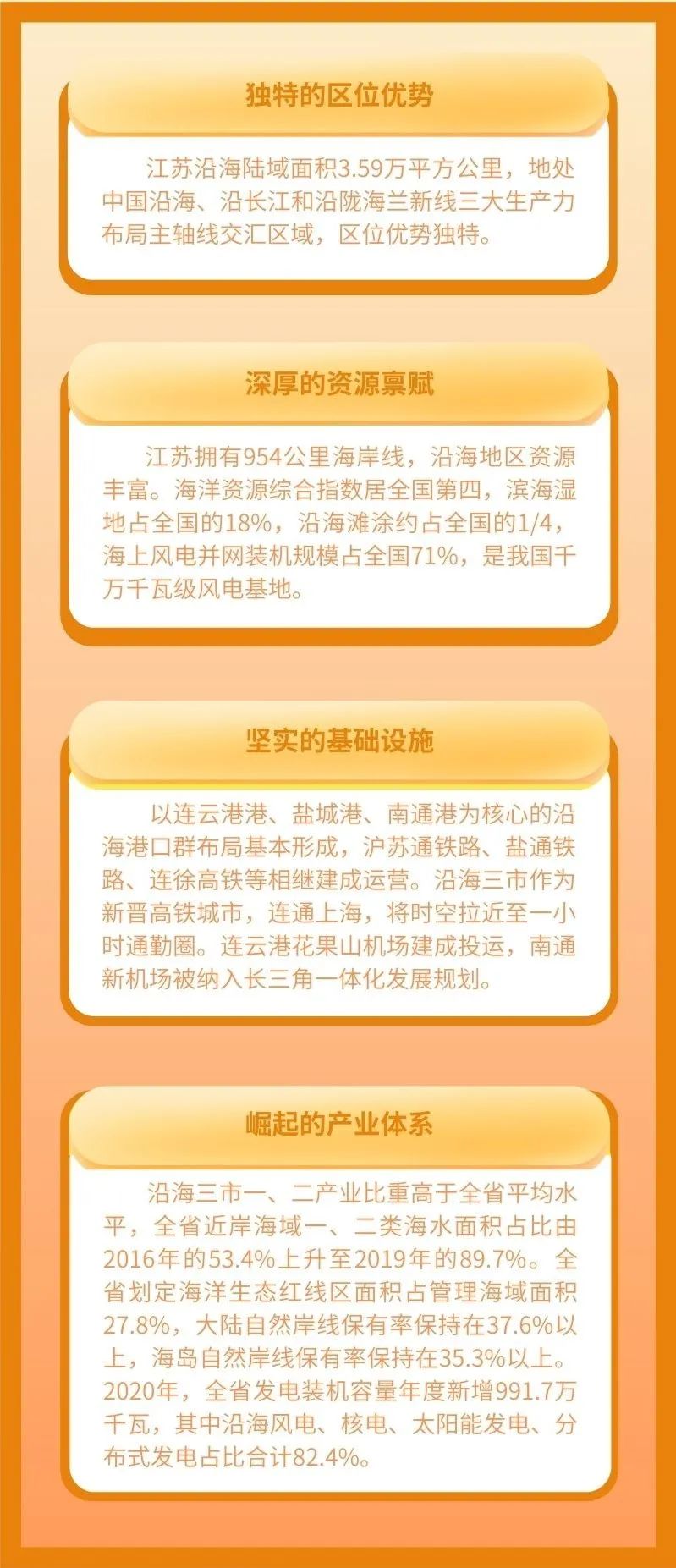 江苏“十四五”规划纲要明确,沿海地区深化港产城融合发展,着力提升海洋经济、生态经济和枢纽经济,打造令人向往的生态风光带、人海和谐的蓝色经济带,成为新的增长极。江苏省第十四次党代会提出,全力推进沿海地区高质量发展,加快陆海统筹发展,大力发展海洋经济,着力塑造“缤纷百里”“生态百里”“蓝湾百里”滨海特色风貌,努力把沿海地区打造成绿色生态高质量发展经济带。
