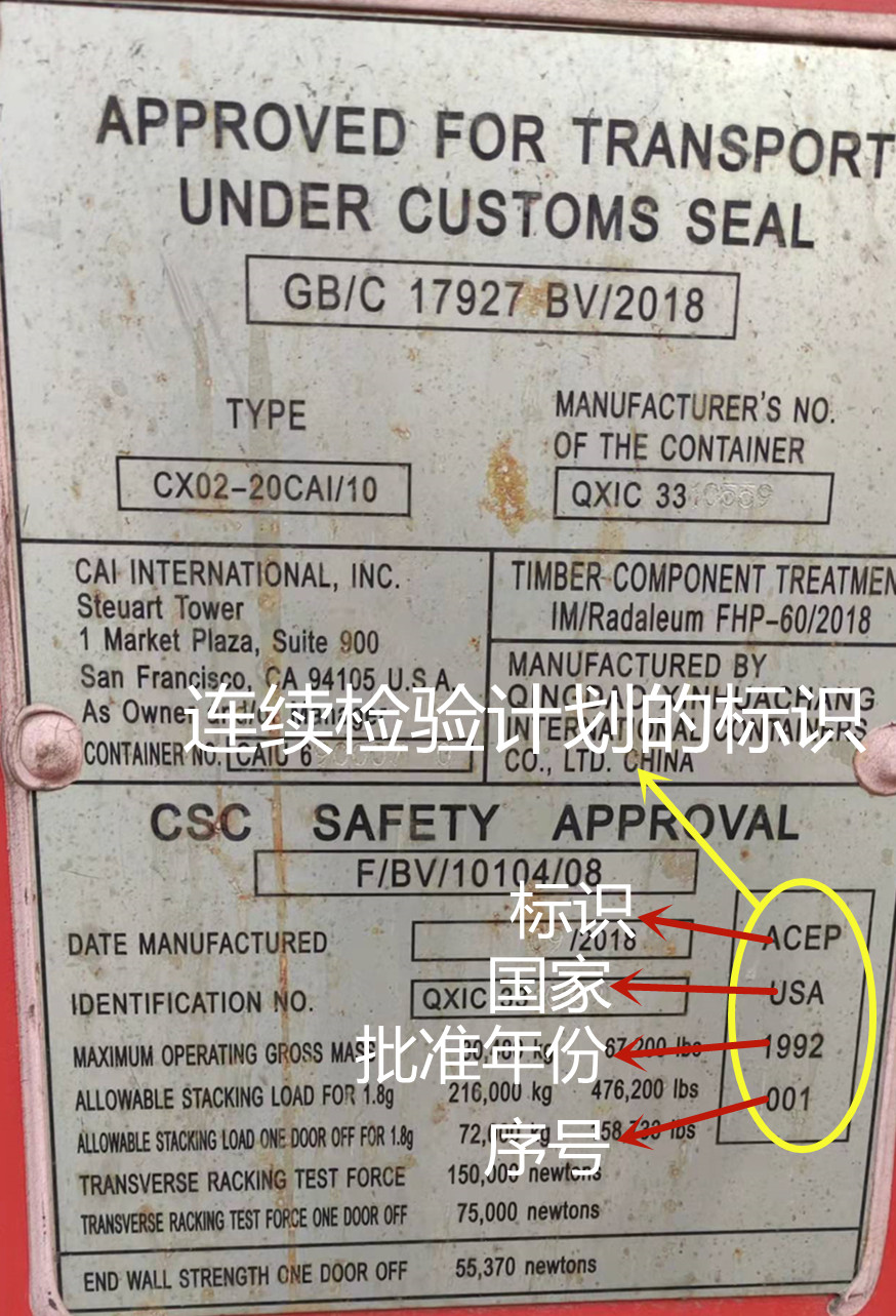 如此一来,即解决了庞大数量的集装箱检验的现实问题! 为表明集装箱按经批准的连续检验计划( ACEP )运行,须在安全合格铭牌上或尽可能靠近安全合格铭牌处,标注字母 ACEP 和批准该计划的缔约国的识别号。