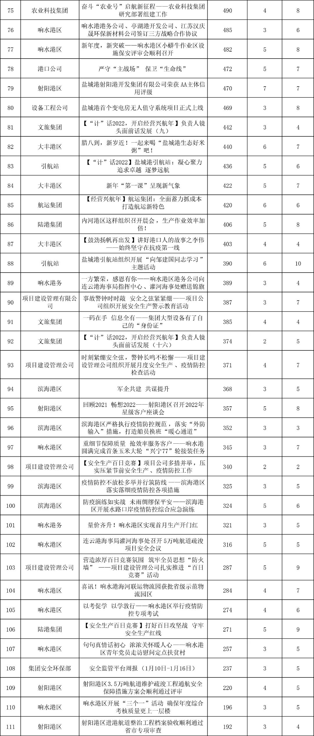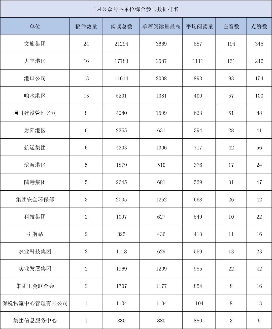 1月,“江苏盐城港控股集团”微信公众号推送文章170篇,截至目前,阅读总量14万+,各单位供稿111篇。其中,文旅集团以2.1万阅读数,24篇稿件量,遥遥领先;大丰港区以1.8万阅读数,16篇稿件量,位列第二;港口公司、响水港区在供稿方面,以同样13篇的数量并列第三,在阅读量方面,港口公司以1.2万的数量,位列单项第三;其他港口及板块集团积极参与,踊跃投稿,情况较好。