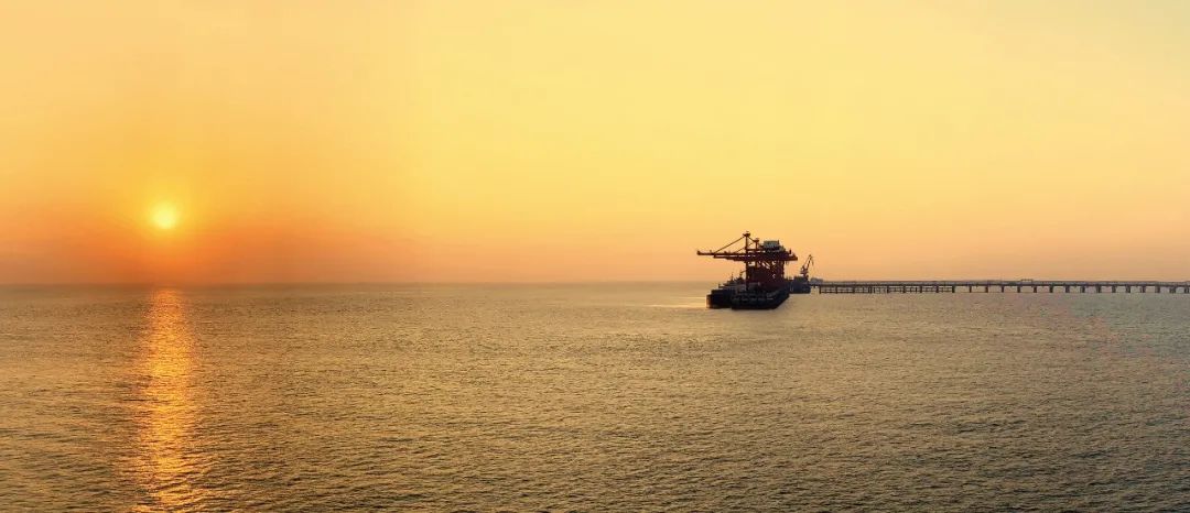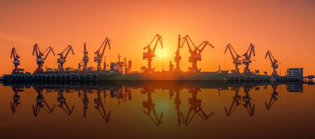 海平面上,太阳冉冉升起,映红了海面和天空,照耀着海港的迷人和神奇,新兴和璀璨。