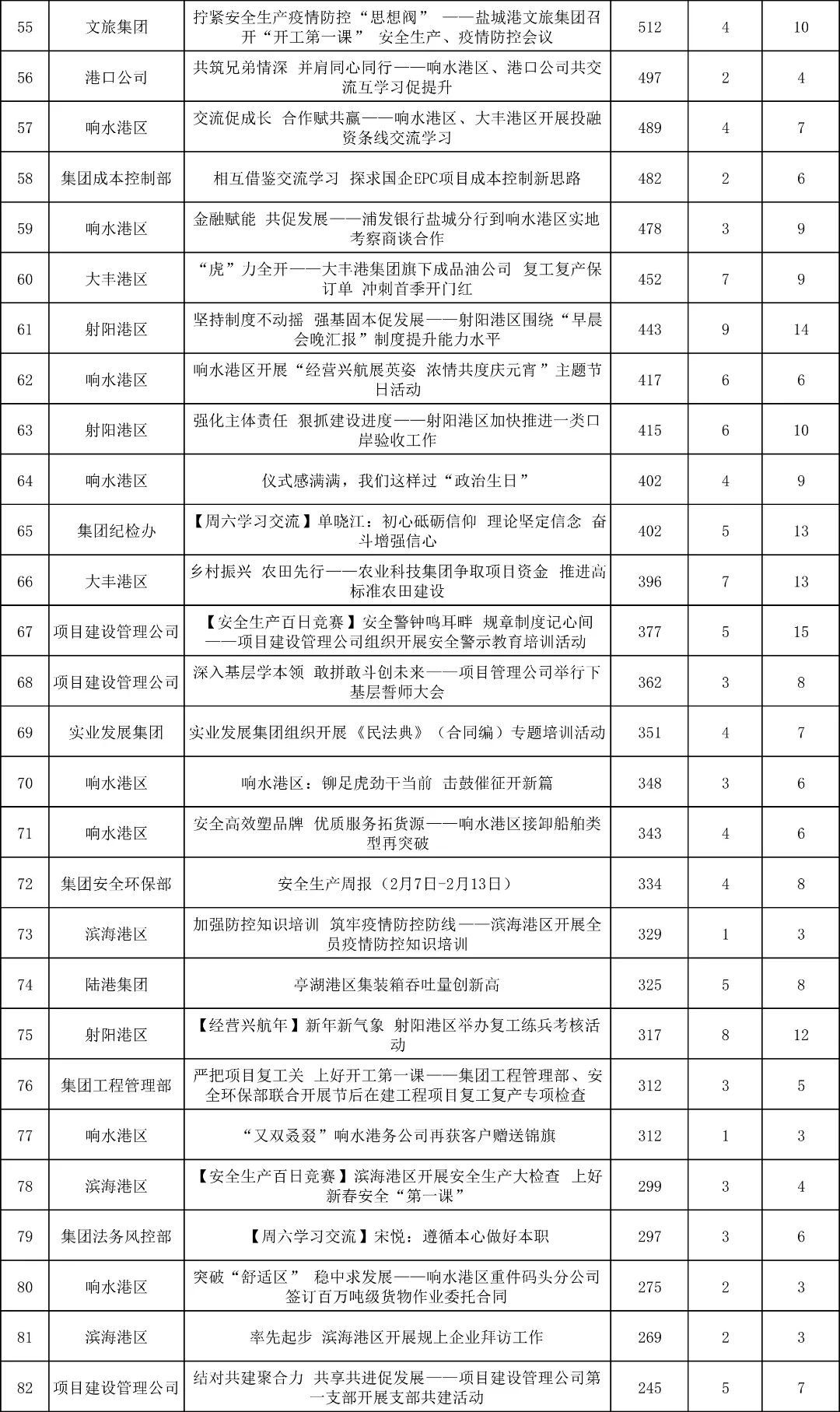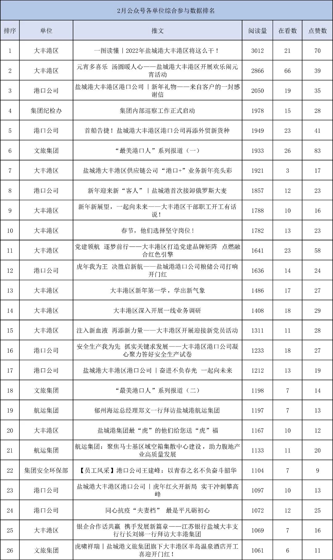 “首季开门红”向来是新闻报道的高产期,特别是一线生产单位亮点频出。从二月份稿件数据统计来看,大丰港区依然蝉联第一“宝座”,发稿18篇;港口公司继续发力,成稿11篇,位列第二;响水港区紧随其后,发稿9篇。其他单位齐齐发力,纷纷积极供稿!