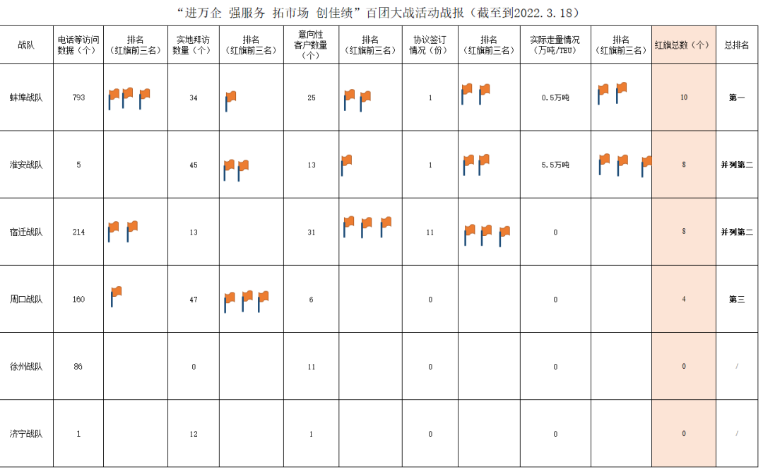2.滨海港区战队:在拜访活动中,滨海港区战队不仅仅局限于规上企业名单,拜访的同时也不忘挖掘周边有可能的企业。通过这种做法也是成功发掘一家化肥贸易企业,吞吐量50万吨,正在商讨合同条款,预计下周签订合同并开始走量。