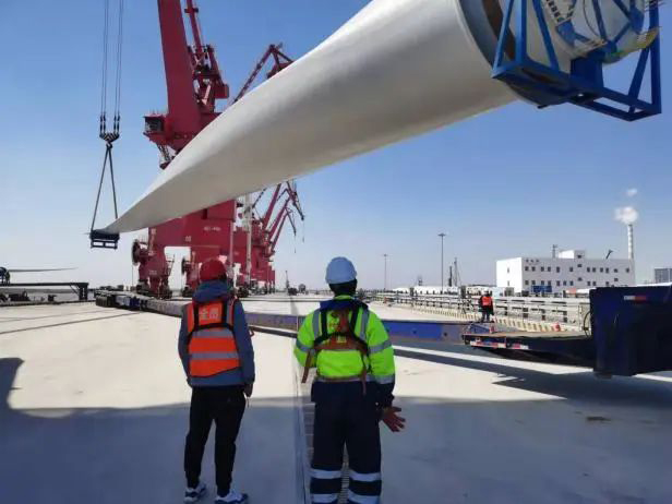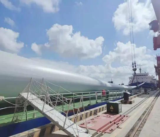 近日,随着射阳港区第二班组指挥员的一句“好,可以往下继续放”,自重40吨的大功率海上风电叶片,从港区3.5万吨级码头1号泊位平稳吊放在振兴5的船舶甲板。看着风电叶片平稳下落,现场作业人员都不由自主地鼓起掌来,这是港区首次自主成功装卸单机叶片长度超过99米的7兆瓦风电叶片,也正式标志着射阳港区已完全具备自主装卸大型风电叶片的能力。