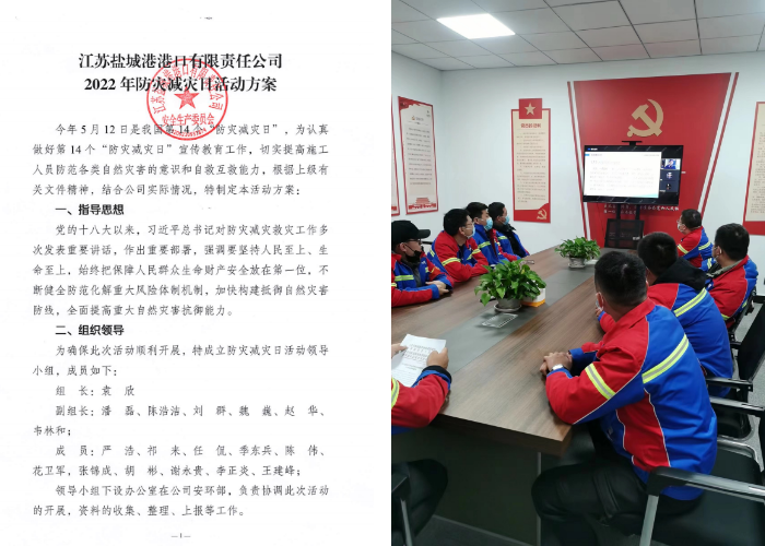 为做好全国第14个防灾减灾日活动,进一步增强公司全体员工防灾减灾意识和应急处置能力,锻造一支听之能用、用之能战、战之必胜的防灾减灾应急队伍,保障公司安全生产形势持续稳定向好,盐城港港口公司严格执行集团统一部署,结合自身情况,以“强化软件硬件,做好防灾减灾”为主线,在公司范围内开展防灾减灾主题活动。