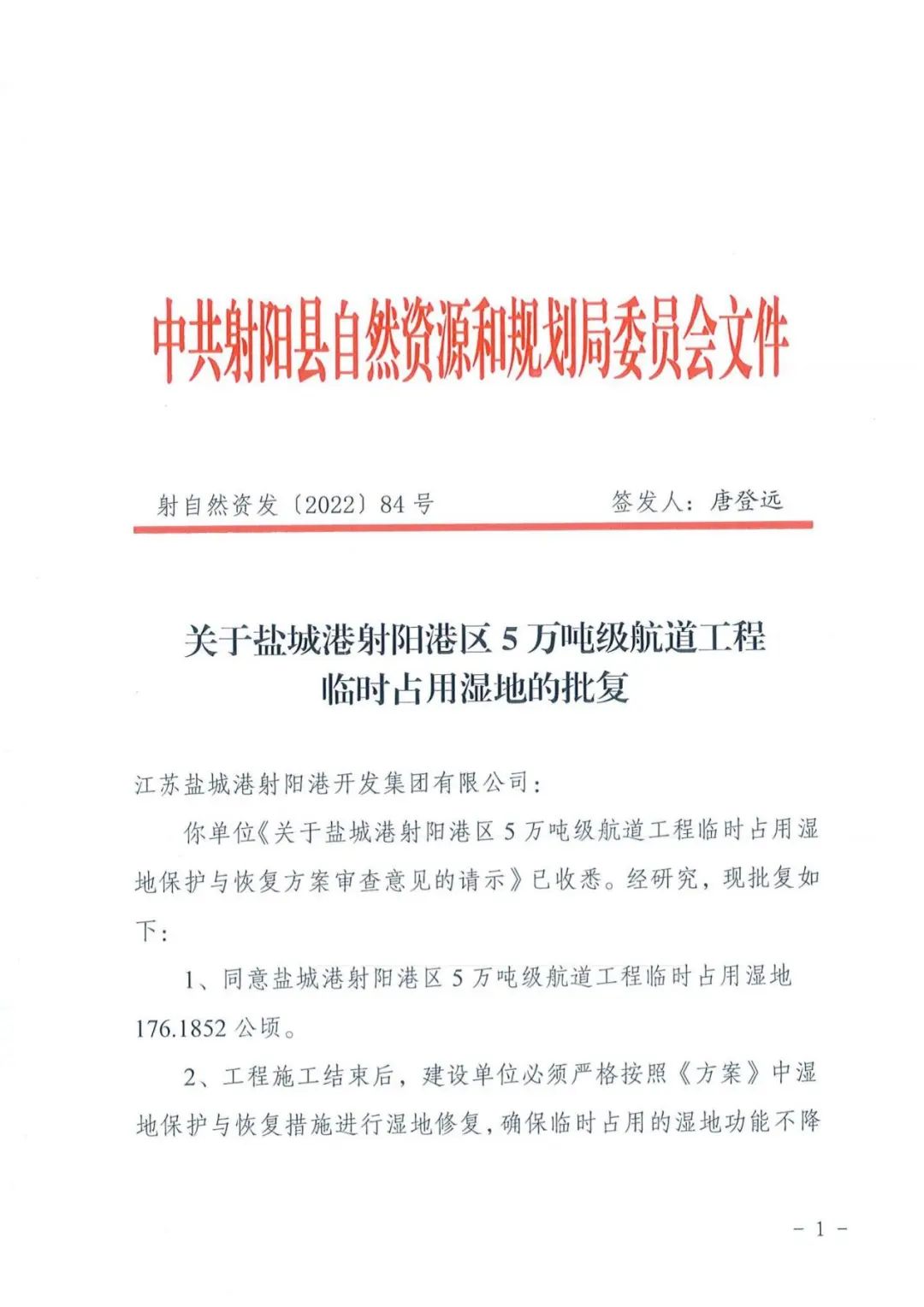 5月9日,盐城港射阳港区5万吨级航道工程临时占用湿地取得县自然资源和规划局正式批复。至此,该项目已完成包括立项、通航评估、安全预评价等在内的十二项前期手续,向项目的正式开工又迈进了坚实一步。