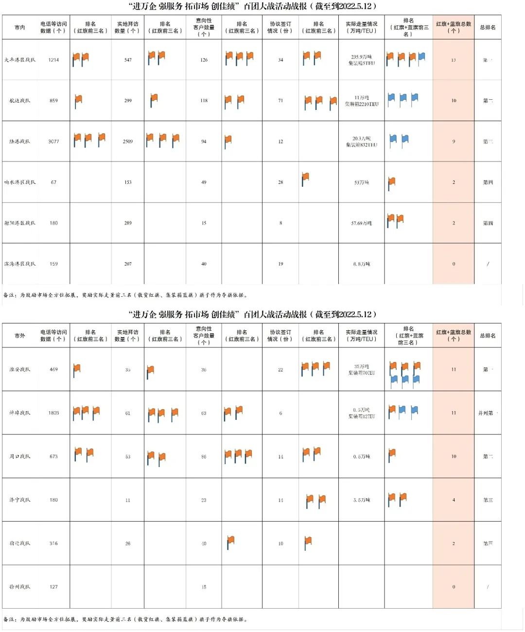 各战队累计拜访客户数据13314家,其中电话、视频等访问9124家,实地拜访4190家,意向性客户705家,签订协议238份,实际走量428.19万吨、3129TEU。具体细分如下: