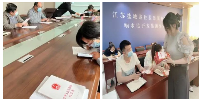 各子(控)公司积极响应集团部署,纷纷利用“学习强企·凝聚硬核”学习日,通过民法典学习手册、民法典宣传视频、民法典读书活动、律师讲座、中国普法网答题活动等形式,组织员工集中学习,扩充知识储备。大丰港区邀请律师就合同篇以案说法;港口公司送法进一线码头管理班组;文旅集团在酒店展播中国普法网《民法典伴你同行》《民法典新时代的圆规尺》等宣传视频实业集团深入社区,发放宣传册,重点宣传高空抛物、饲养动物、建筑物区分所有权等法律知识,担当普法惠民社会责任。
