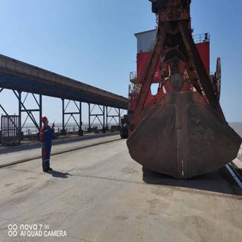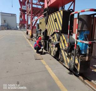 随着一声指令的下达,演练正式开始,粮食码头1#泊位“腾海明宇”轮作业过程中突然接上级通知,码头1小时后将突发强对流天气,伴有雷电、大风、暴雨等紧急情况。现场调度立即启动突发极端天气机械设备防风锚定应急预案,门机停止作业、抓斗降至码头面、更换钩头、放下行走锚定,保障人员拉起门机防风拉索、安全巡查员对各处防风锚定情况进行再检查、作业车辆就地停车并开启双闪、设备维护组人员全部保持待命抢修状态。在场人员分工明确、各司其职、井然有序,仅用10分钟,所有机械锚定任务全部完成,所有作业人员撤离到安全区域进行复盘点评,演练圆满结束。