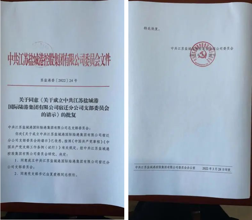 3月28日,中共江苏盐城港国际陆港集团宿迁分公司党支部成立;