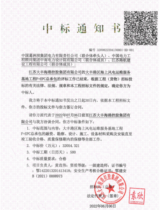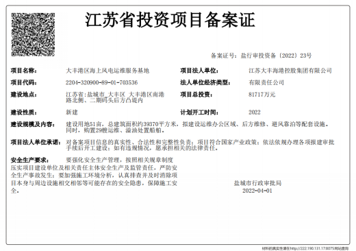盐城港大丰港区海上风电运维服务基地项目为市城乡建设重点房建项目之一,位于大丰港区南港路北侧、物联大厦东侧,二期码头后方凸堤内,建设用地51亩,建筑面积约39370㎡,项目总投资81717万元,拟建设运维办公区、维修车间、安全培训中心等,后期部分建设避风靠泊等配套设施;同时购置29艘运维、溢油处置船舶,通过建立运维基地,统一运维,打造专业运维队伍,共享运维配套资源及数据,降低盐城地区各个海上风电的运维成本,促进海上风电高效运行,带动风电产业链的发展。