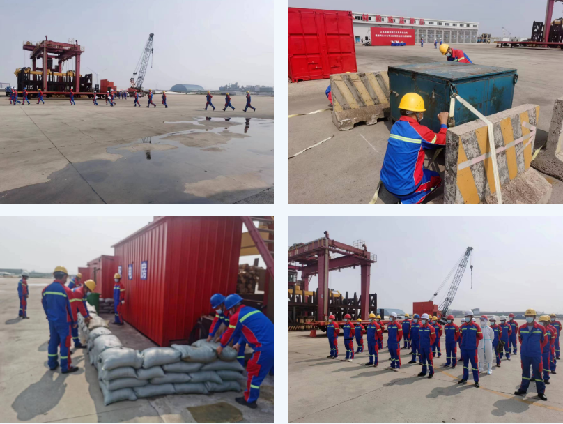 本次演练模拟我区域即将出现强降雨、8级以上雷暴大风天气所造成的气象灾害情况。演练打响后,安环科首先通报气象预警信息,向总指挥汇报应急抢险救援队伍和应急物资准备情况,各成员单位根据各自职责汇报防御工作落实情况。总指挥按照防汛防台总体预案要求,立即启动“防汛防台Ⅱ级应急响应”,并下达非抢险人员转移、通用堆场区域紧急抢险排涝、各类设备防风加固、所有门窗紧闭等防御指令。各小组人员根据指示,紧密配合,协同合作,采取停止作业、转移人员、铆钉机械、转移货物、堆放沙袋、启动强排站等应急措施,全力保障人员健康安全、设备货物完好。