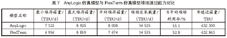 经综合分析发现,无论是单一场桥利用率还是平均场桥利用率,AnyLogic仿真模型的数据结果都普遍高于FlexTerm仿真模型的数据结果。通过分析堆场作业系统仿真流程发现,上述差异是由2种仿真模型的作业指令生成模式不同导致的。在相同的作业时段内,AnyLogic仿真模型的作业指令生成的作业数量要高于FlexTerm仿真模型的作业指令生成的作业数量,从而导致AnyLogic仿真模型的场桥利用率高于FlexTerm仿真模型的场桥利用率。根据港口提供的数据,全年该港口自动化堆场的场桥利用率在40%~60%。基于AnyLogic仿真模型和FlexTerm仿真模型仿真得到的平均场桥利用率分别为42.4%、35.7%。显然,与FlexTerm仿真模型的仿真结果相比,AnyLogic仿真模型的仿真结果同实际作业数据的统计结果更接近。究其原因,这是由2款仿真模型的集装箱装卸作业指令的生成模式不同导致的。对堆场作业系统仿真流程分析发现:在AnyLogic仿真模型中,集装箱装卸作业指令是根据港口历史数据,借助算法计算生成的,比较接近港口的实际作业数据;在FlexTerm仿真模型中,集装箱装卸作业指令是利用软件自带作业计划模块,通过配置船期、堆场计划等参数自动生成的,与港口实际作业数据之间存在一定的差距。4.2 堆场使用情况对比为了合理规划堆场空间资源,根据港口提供的船期、堆场计划等参数,对港口堆场的使用情况进行仿真对比分析。AnyLogic仿真模型与FlexTerm仿真模型堆场通过能力对比见表7。由表7可知,在相同输入条件下,AnyLogic仿真模型和FlexTerm仿真模型仿真模拟得到的堆场利用情况和堆场通过能力基本一致。但由于泊位船舶计划较为宽松,船期密度小于实际船期数据,AnyLogic仿真模型和FlexTerm仿真模型的堆场通过箱量分别为632 300 TEU和632 863 TEU,均小于港口全年实际堆场通过箱量724 272 TEU。