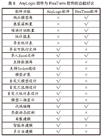 通过仿真分析结果与实际作业数据的对比发现,仿真分析结果与港口实际运行数据差距较小,表明AnyLogic仿真模型和FlexTerm仿真模型都能准确可靠地模拟港口实际堆场作业情况,能够满足港口堆场仿真需求,并有助于提高港口堆场仿真的准确度和可信度。此外,通过分析堆场仿真作业流程还发现,通过调整堆场仿真系统的输入条件能提升AnyLogic仿真模型和FlexTerm仿真模型的仿真效果,其中:通过调整输入条件对应的关键参数来提升AnyLogic仿真模型的仿真效果;通过修改输入条件中作业计划模块的船期、堆场计划等相关配置来提升FlexTerm仿真模型的仿真效果。4.3 软件功能对比回顾整个堆场仿真作业流程发现,2款软件在功能应用方面存在一定差异。根据仿真作业流程和仿真分析结果,对2款软件的功能进行对比分析,AnyLogic软件与FlexTerm软件的功能对比见表8。