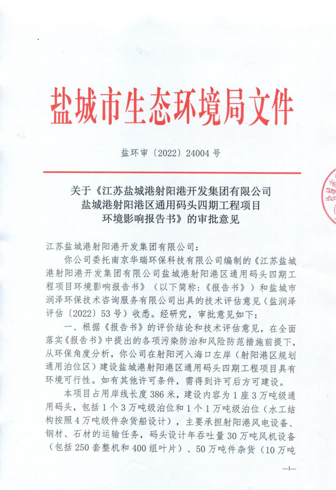 7月13日,盐城港射阳港区通用码头四期工程项目海洋环评取得市生态环境局正式批复。至此,该项目已完成所有前期手续,向项目正式开工又迈进了坚实一步。