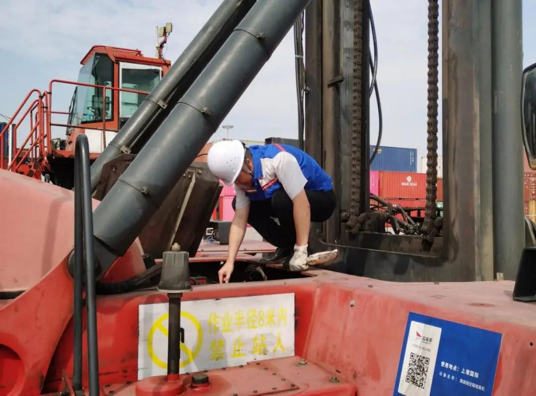 在今年4月初,大丰港区的一台卡尔玛堆高机因为电气故障抛锚,严重影响了正常的生产。港区维修人员第一时间联系售后单位,售后人员通过电话指导排查故障点,却迟迟不能找到原因,唯有进行现场检查排故。当时上海疫情严重,售后人员需要层层报备、审批、隔离后才能到达现场,漫长的等待期将严重影响集装箱的正常作业进度。此时现场维修人员打电话给倪旅军同志咨询其他故障时,偶然提到了这台机的问题,倪旅军同志知晓后立即驱车前往集装箱堆场了解故障情况。经过短短20分钟的现场排查,他成功找到并解决了堆高机的故障,使之能够正常作业。