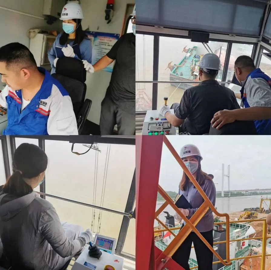 在灌江码头一位年轻女孩在门机驾驶室里认真研学。我们都问她:“你一个女孩在这么热的天里来学门机操作,不怕晒黑吗?”。她总是笑着说:“因为我想做港口最美‘炎’值啊”。从响水港区综合部到一线,挂职人员吴亦凡给灌江码头增添了一抹靓丽色彩。从集团机关来的挂职人员宋昊也说:“以前只是坐在办公室里,现在来到一线感觉真的不一样。通过学习熟悉了港口的设备以及操作流程,我的工作思路更加开阔了。我会好好珍惜此次机会”。师傅们通过理论与实践相结合的方式传授不同货种的作业经验,将多年来记录的工作笔记以及遇到的各类门机故障整理分享给徒弟们。借助师傅的“技术宝典”,挂职人员吴亦凡、宋昊很快就掌握了门机的结构原理以及操作方法。