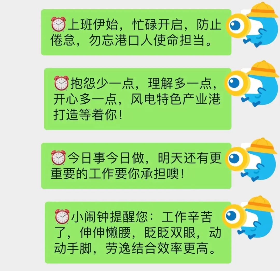 叮铃铃,“上班伊始,忙碌开启,防止倦怠,勿忘港口人使命担当。”每天一上班,打开电脑,首先弹出上述信息。这是射阳港区新增设的办公“闹钟小贴士”的管家信息。提醒各位员工,作为盐城港人,要时刻不忘肩负的“架起盐城走向世界海上大通道”时代使命,必须时刻保持永不懈怠、奋发拼搏的精神状态,做好自己的本职工作。