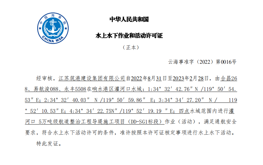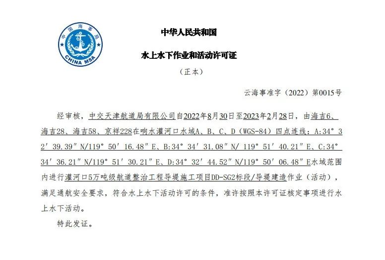 【项目大推进】盐城港响水港区灌河口5万吨级航道整治工程导堤施工项目获批水上水下活动许可证