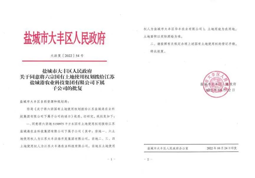 农业科技集团成立办证工作小组,专项推进办证工作,积极主动对接大丰区政府、港区管委会属地政府及市自然资源和规划局、上海农场、盐业公司等四址相邻单位,协调属地政府批复、四址确认等权证办理手续,确保权证办理工作有力有序推进。