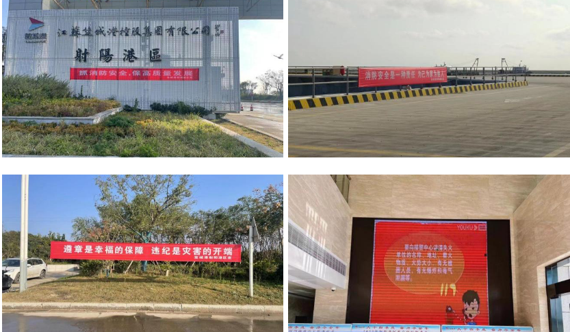 注重宣传引导,在增强辐射力带动力上下功夫。为做好消防宣传月活动,进一步普及消防安全知识,全面提升港区全员的消防安全意识,提高自护、自救和互助能力,射阳港区通过在港区张贴消防宣传海报,悬挂消防宣传横幅,办公区大屏循环播放消防安全宣传片等方式,大力宣传消防安全科普知识,增强港区全员消防安全意识。