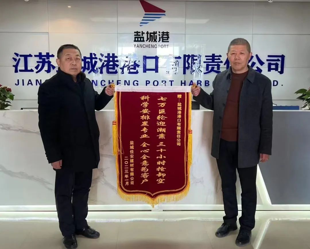 兔年伊始,盐城港港口公司收到盐城佳安建材有限公司赠送的锦旗,对港口公司所提供的优质装卸服务表示感谢。