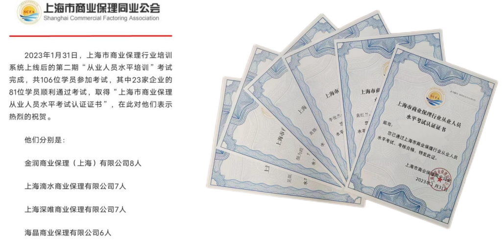 近日,海晶商业保理有限公司6名员工参加上海市商业保理水平培训,顺利通过考试并取得认证证书。考试通过人次在上海市商业保理行业名列前茅,充分展示了出色的专业水准。