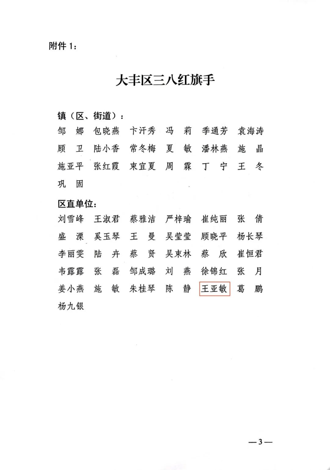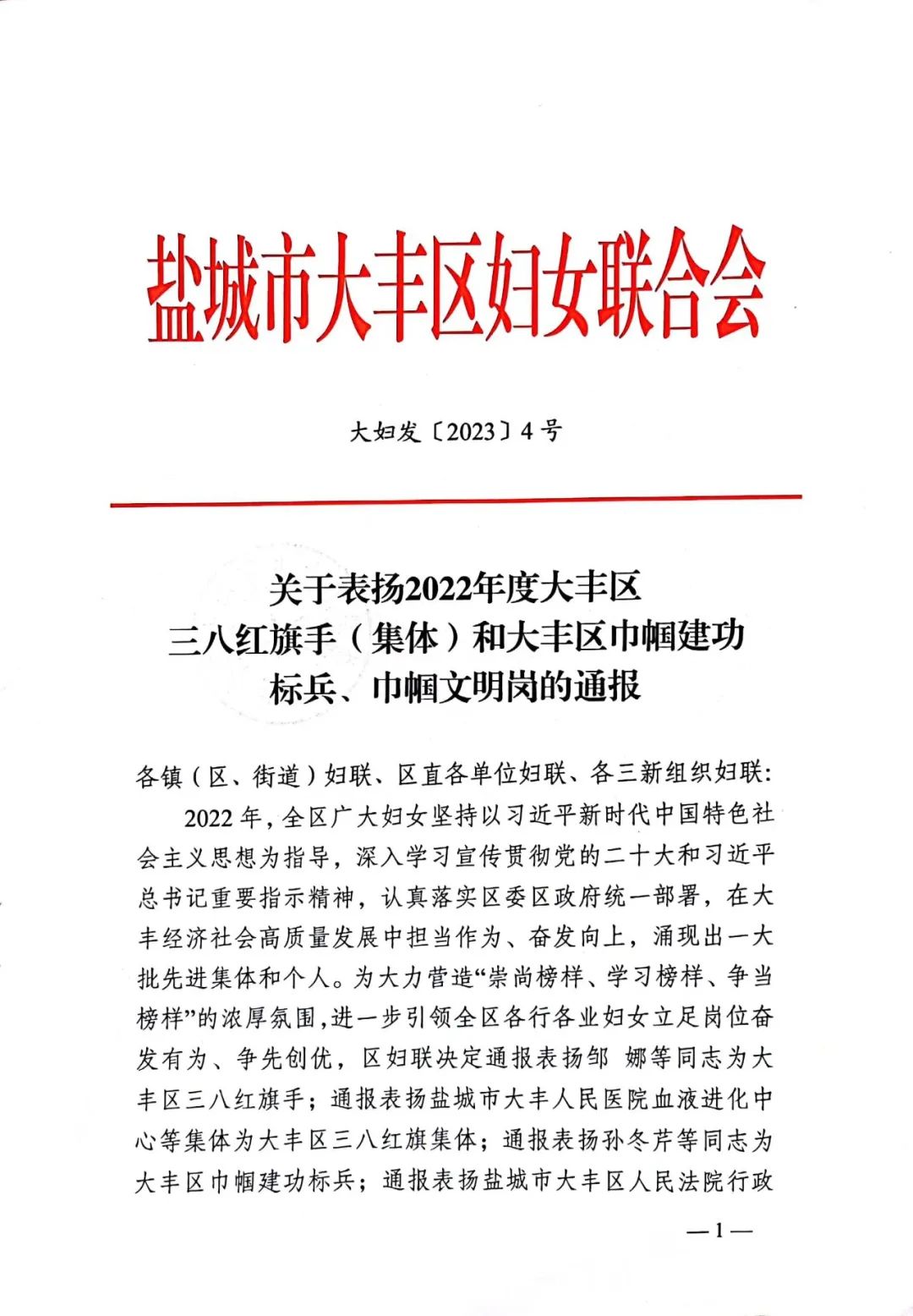 近日,大丰区妇女联合会发表《关于表扬2022年度大丰区三八红旗手(集体)和大丰区巾帼建功标兵、巾帼文明岗的通报》,盐城港大丰港区成品油公司水上加油站“木兰”班组荣获“巾帼文明岗”荣誉称号,班组成员王亚敏荣获“三八红旗手”荣誉称号。