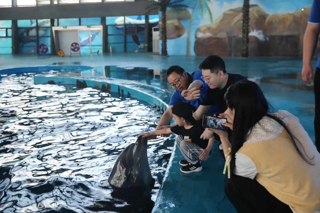 盐城港大丰港区海洋世界是以海洋为主题的情景剧式互动体验馆,在这里,小朋友们观看了海豚表演、了解了海洋知识。在柔和的音乐声中,海豚开始表演节目,从水中一跃而上,溅起晶莹的水花,而后如同身姿矫健的跳水运动员轻轻落入水中;它们在训导员的指挥下,尽情地舞动着,展现着优美的舞姿。现场响起了一阵阵喝彩和掌声,整个表演都充满了灵性,观众们深深地被海豚的英姿所震撼。表演结束后,现场还有和海豚合影的机会,小朋友们大胆伸出双手去抚摸它们,现场气氛热烈,小朋友们流连忘返。