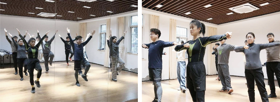 大家时而曲腿、时而展臂