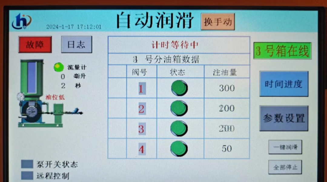 而本次改造后的集中润滑系统是信息技术、自动化控制技术、现代润滑技术充分优化集成的高新技术产品,预计每年可以降低港区人力成本及设备维修成本不少于15万元。具体可体现出九大优点:能够精准设置、控制每个智能分油箱出口的出油量;能够精确设置、控制不同机构的注油周期;能够设置、控制每个润滑点的需油量;能够监控智能分油箱每个出油口的堵塞故障和报警;能够监控系统主管路的泄漏故障及报警;能够监控油桶储油量的缺失及报警;能够通过控制箱进行查看实际润滑情况及故障;能够根据机构运行时间设置大周期,且故障信号、注油信息与主机PLC互联互通并可在手机端进行实施监控设备润滑状况的操作。
